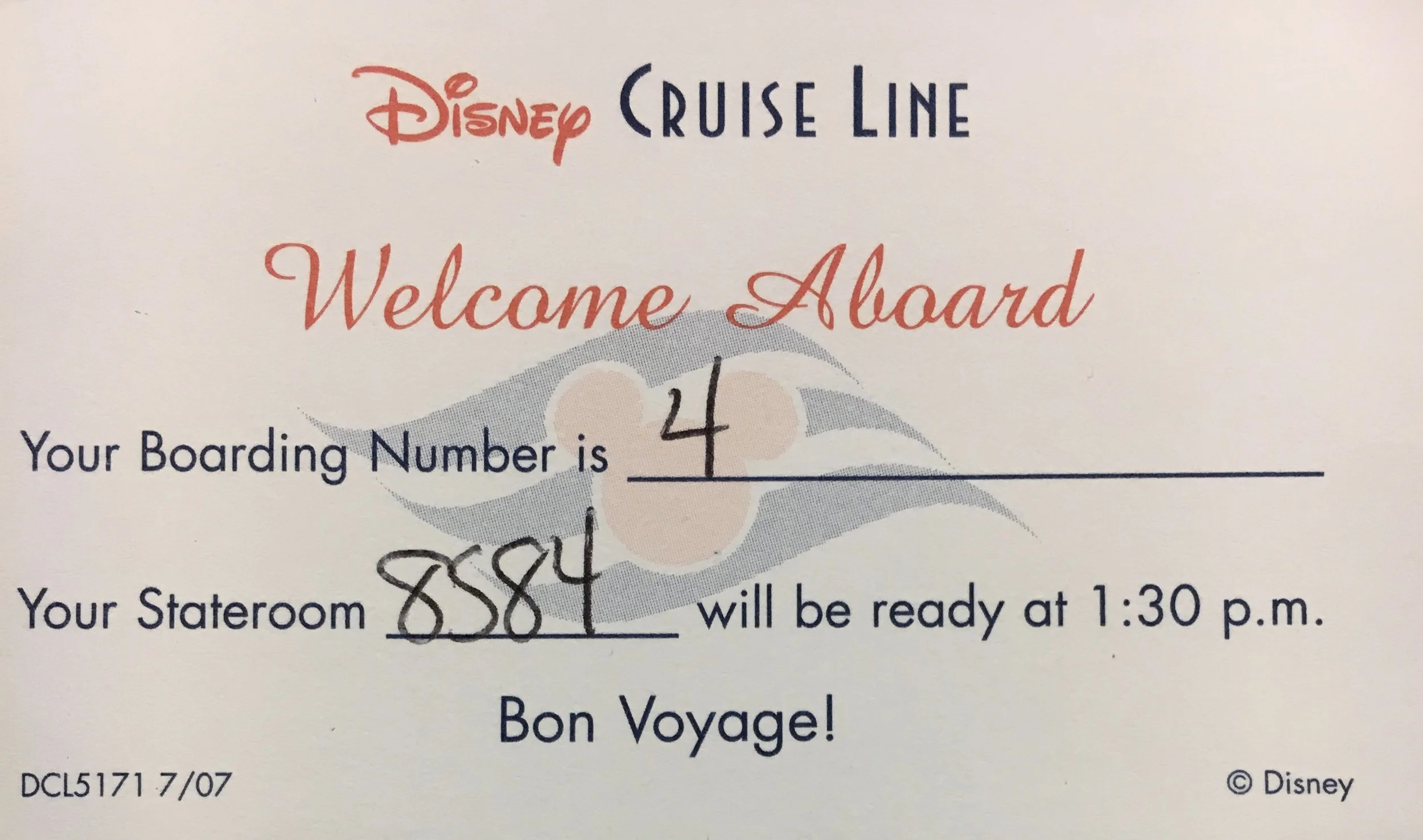 Once on the ship, most people head straight to the elevators. Be prepared to wait a little. If your carry-ons are light and you have the leg strength, take the stairs up to your destination. It will be a lot less crowded. Your room will not be ready until the time indicated on your boarding card. Disney is very precise with the time so don't expect your room to be ready early. My advice is to head up to the main deck and have lunch at the buffet and grab a table either inside or out on the deck. Some people prefer to snag a place in one of the lounges.
