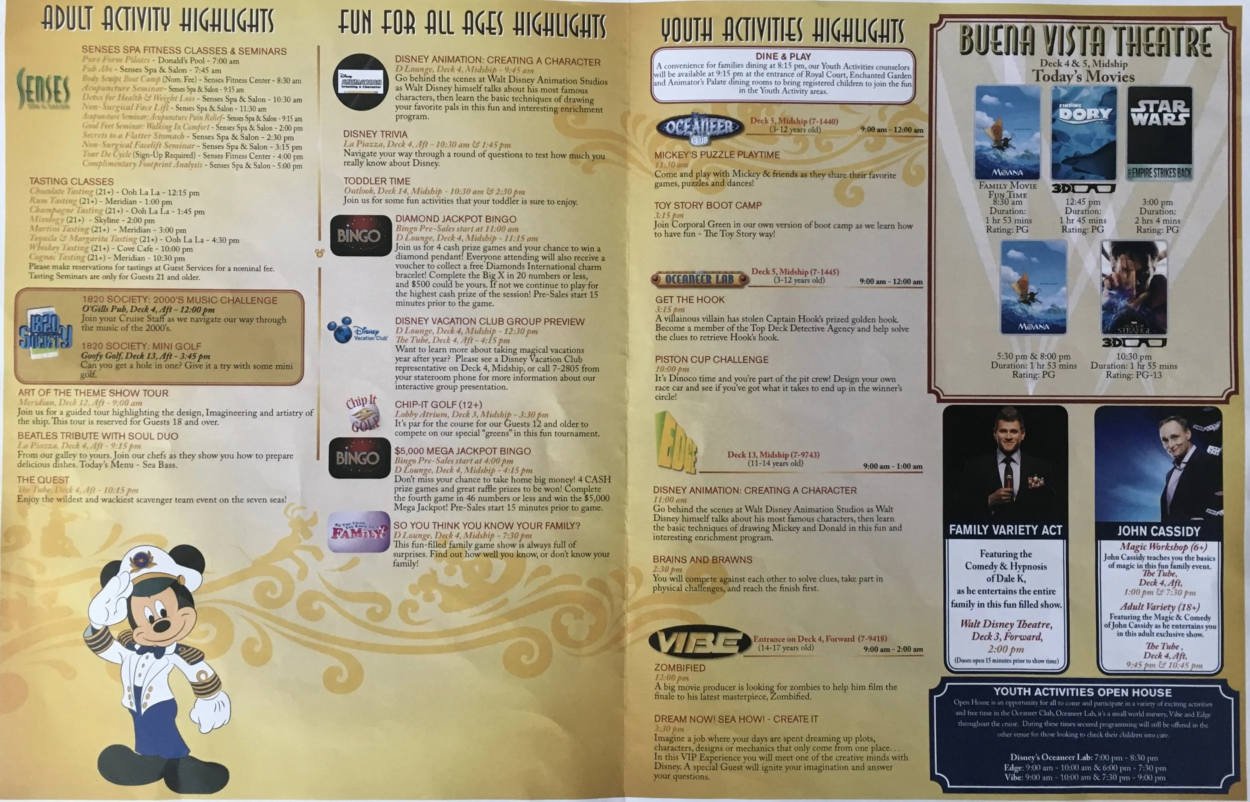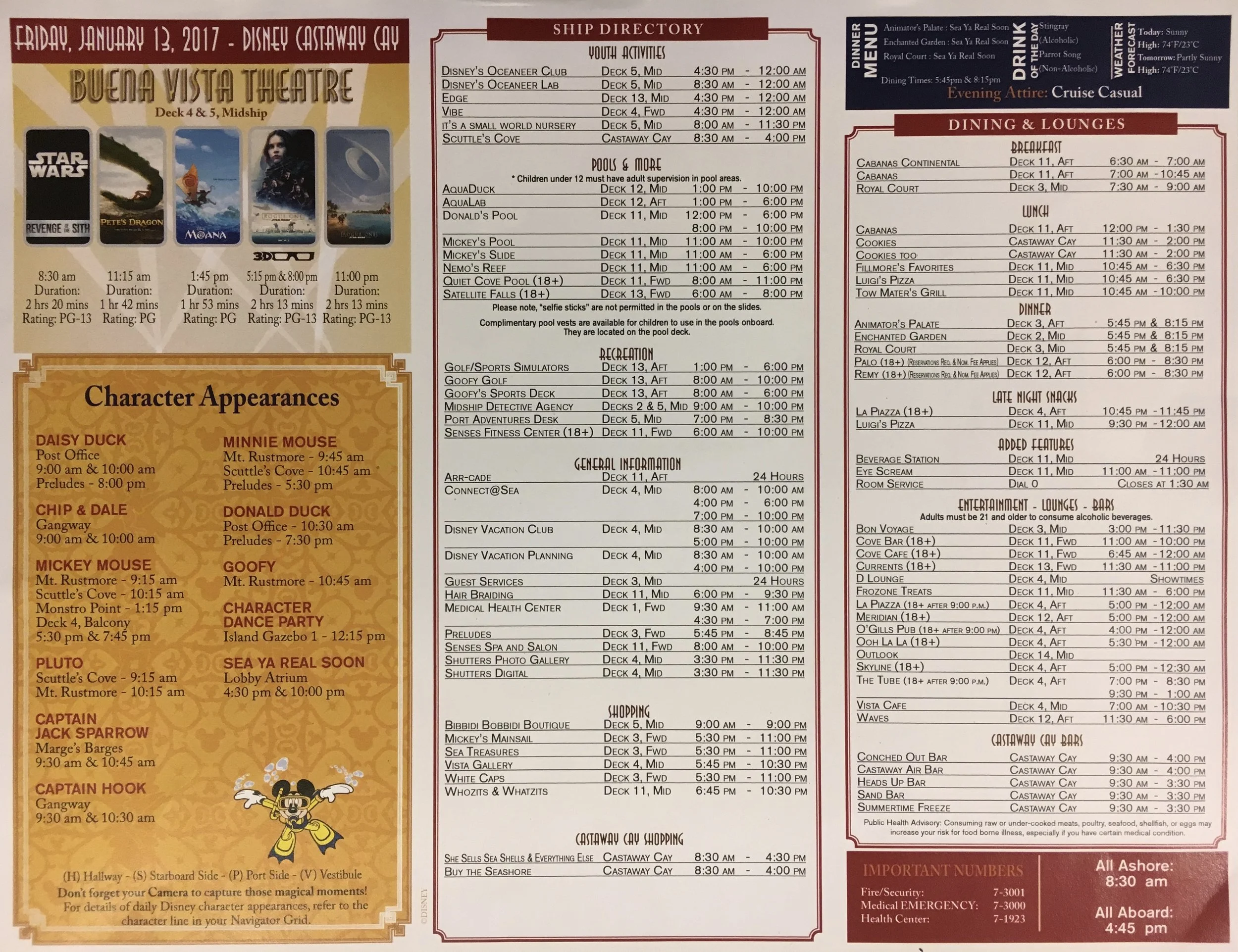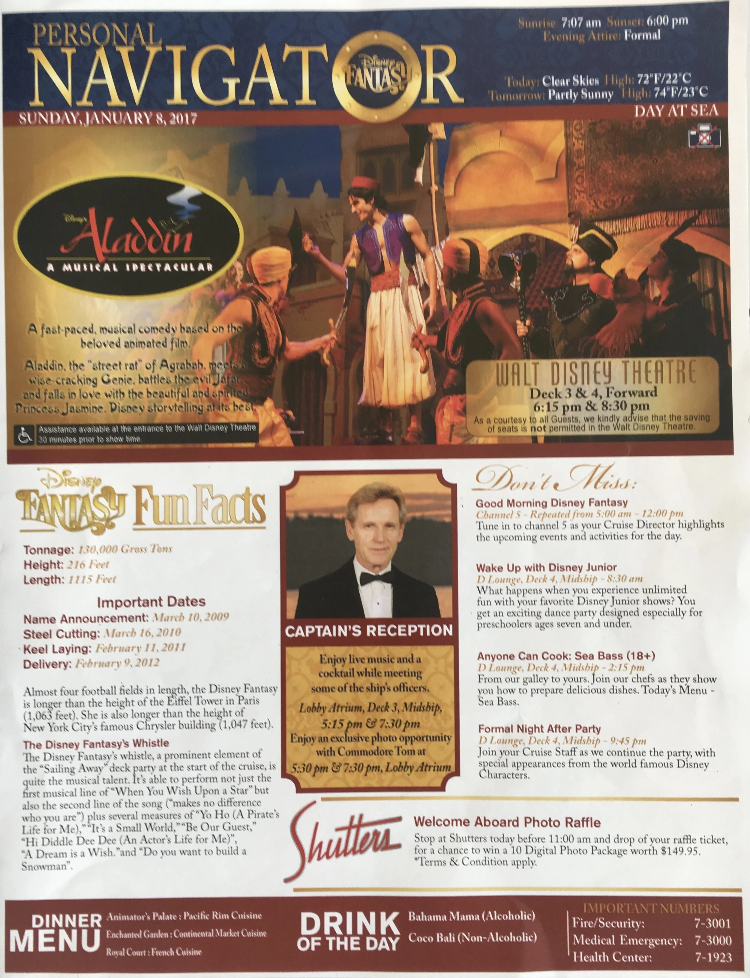 The Personal Navigator is a daily itinerary that lists all of the events happening on the ship that day. It also comes with a more detailed itinerary that lists the hours for all of the shops, lounges, bars, eateries, and events on the ship. You will receive a Personal Navigator at check in and every evening for the duration of your cruise. Your Personal Navigator with the next day's itinerary is placed in your stateroom each evening during your turn down service.