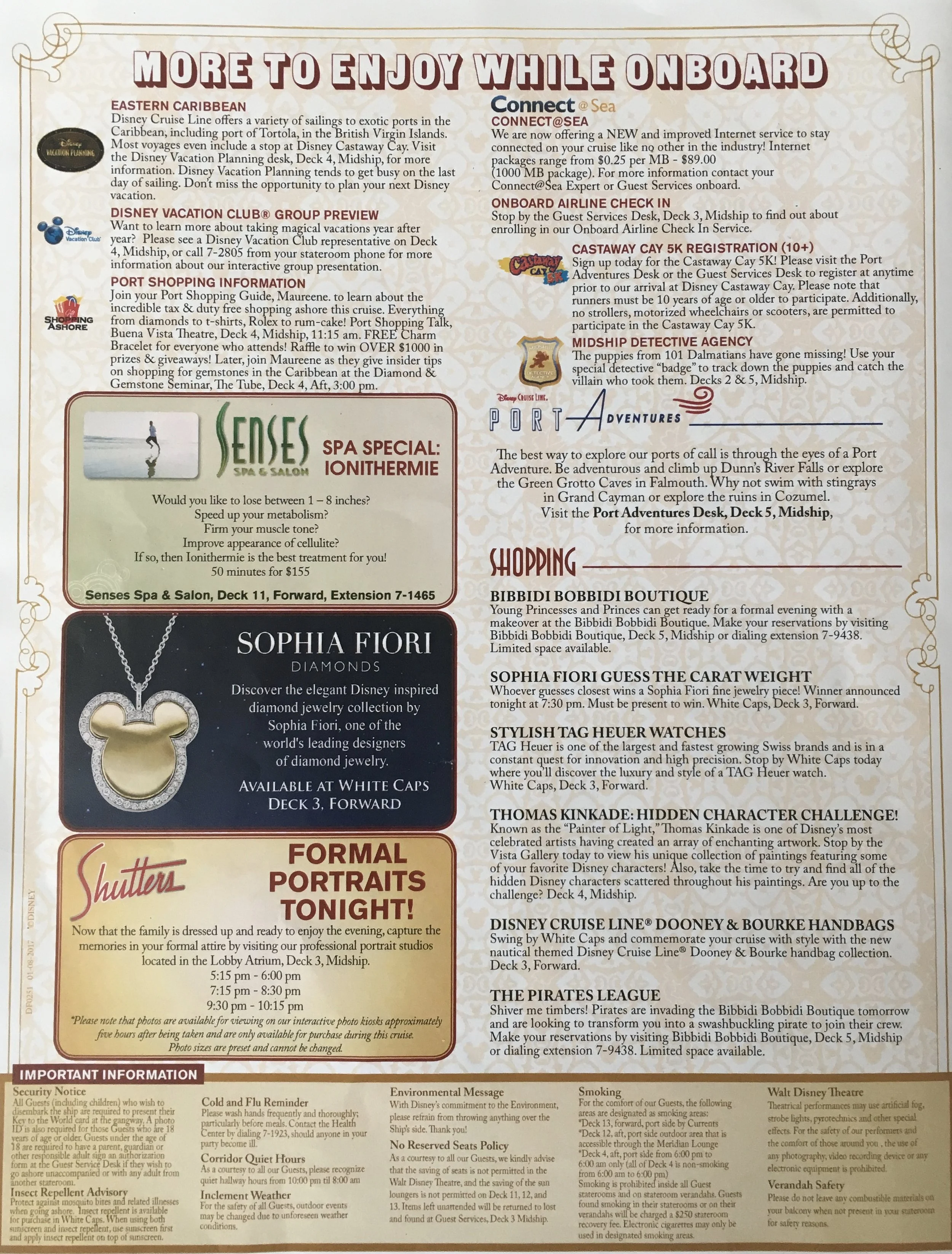 TIP: Check the Personal Navigator and Voyage Navigator for special deals when your first receive it at the cruise port. Many times there are offers for free or reduced cost that are only available if you sign up on the first day of our cruise. A popular one that we always use is free internet minutes, only available is you sign up on the first day.
